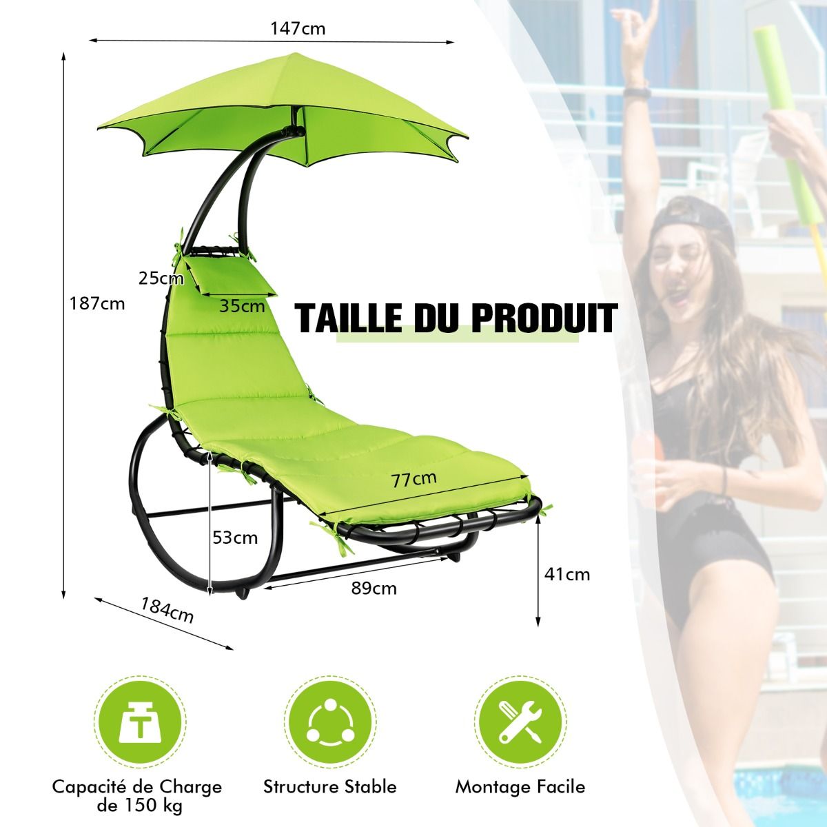 La conception de balançoire lisse permet de se détendre. En outre, la courbe incurvée de la structure réduit également la pression exercée sur vos lombaires et votre colonne vertébrale. Fabriqué en tissu polyester et coton épais, un coussin entièrement rembourré et un appui-tête supplémentaire vous offrent une expérience de couchage confortable. De plus, une structure en acier résistant à la rouille et un dispositif anti-basculement le maintiennent stable et robuste. Il peut supporter jusqu'à 150 kg. Nous le concevons également avec un auvent d'ombrage pour résister au soleil. Vous pouvez utiliser un bouton de fixation d’auvent pour l'assembler et le retirer facilement. De plus, un manuel d'utilisation clair et tout le matériel nécessaire permettent un assemblage facile. Des cordes de fixation vous permettent de fixer solidement le coussin au cadre. Et c'est un ajout parfait au porche, au jardin, au balcon, au patio, à la cour, au bord de la piscine, sur le bord de mer et plus encore.